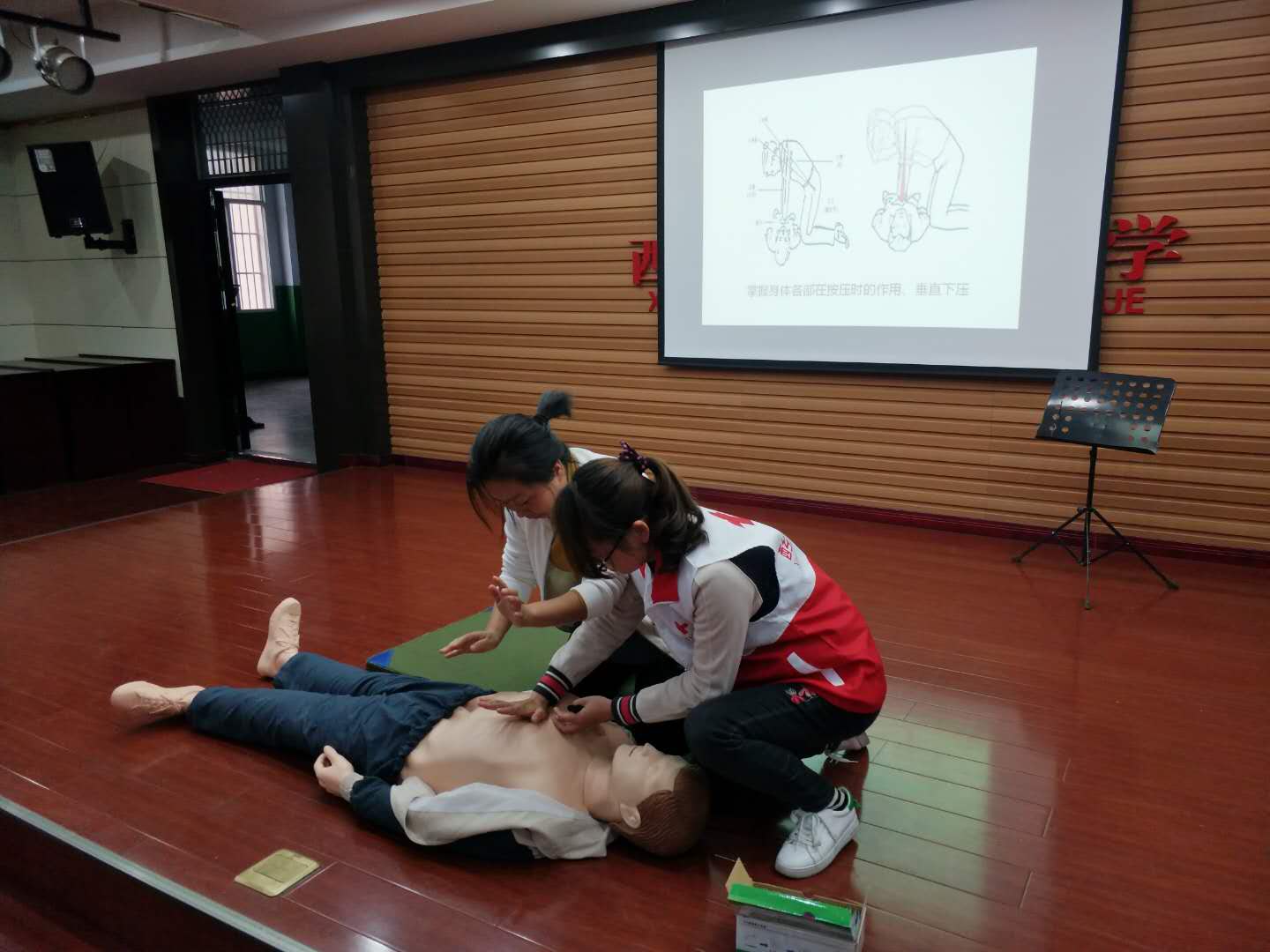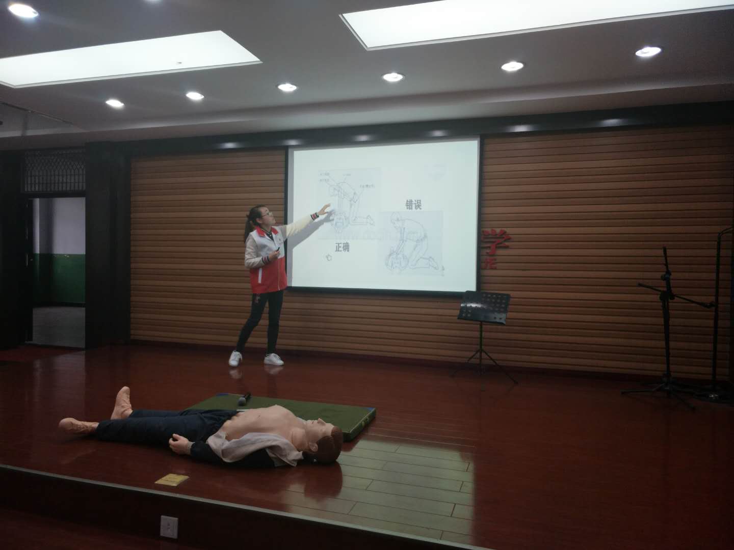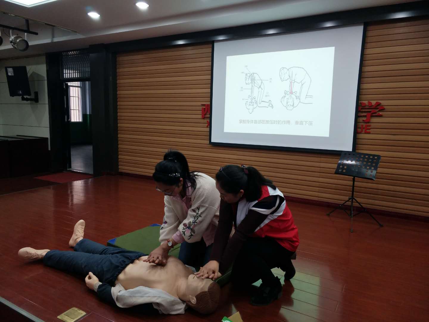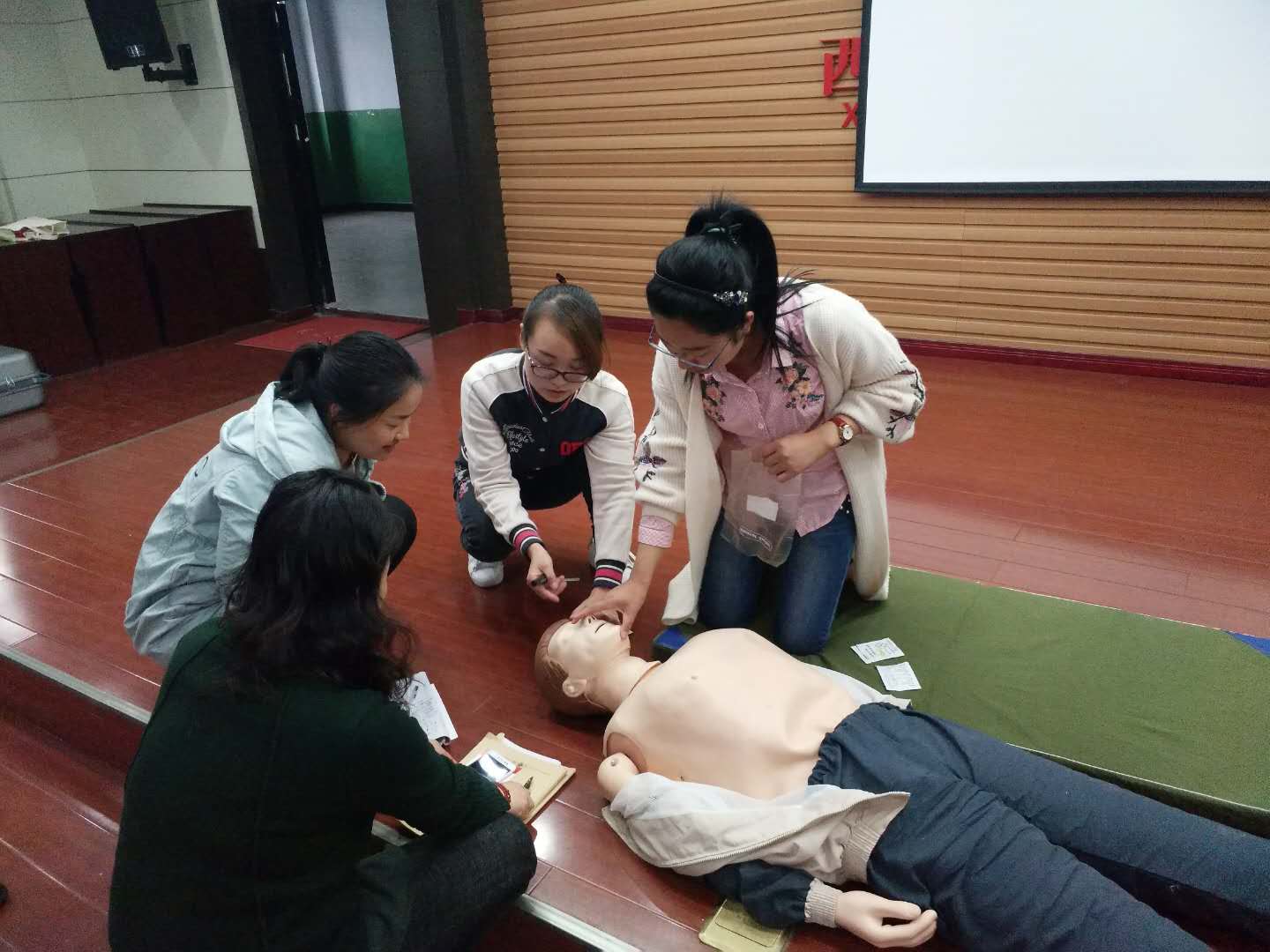 培训中,李老师采用生动形象、诙谐幽默的语言,讲解了心肺复苏操作步骤,并现场进行了操作演示。通过讲解和实操,有效地提高了校内教师在发生紧急情况时自救互救的意识和技能,让行之有效的急救方法遍布校园的每一个角落。培训现场共计发放宣传资料60余份。